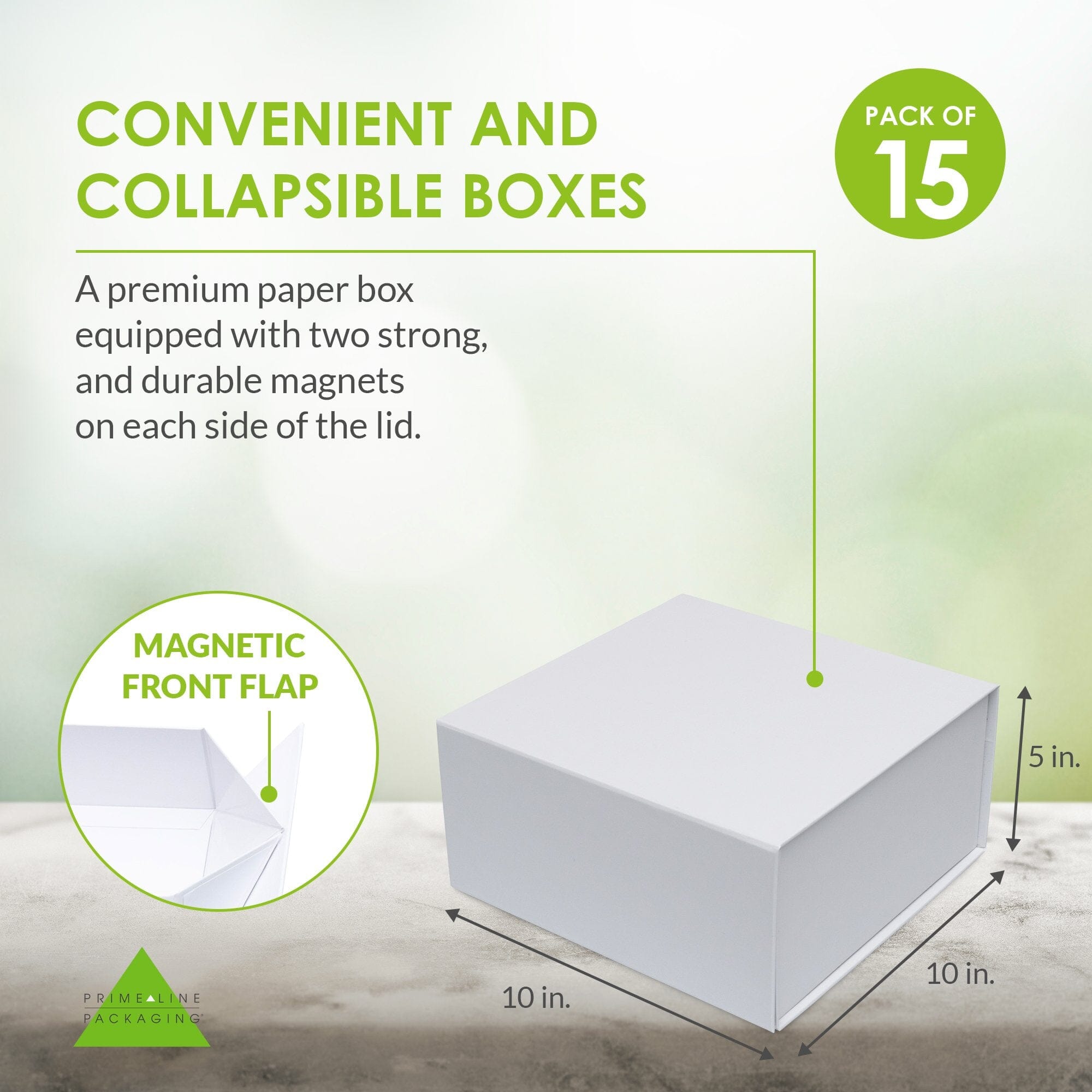 Prime Line Packaging's unprinted white 10x10x5 collapsible magnetic closure gift boxes are the perfect option for packing, storing, organizing, displaying, and presenting a wide variety of personal and professional needs. Crafted from a durable 1,200 GSM art board wrapped in premium 157 GSM gloss laminated paper, each high-quality gift box comes equipped with two extra strong magnet closures seamlessly incorporated into the lid to ensure its contents stay safe and secure. When not in use, each magnetic gift box can conveniently fold flat for easy, compact out of the way storage. White gift boxes are a perfect, high quality, reusable and practical alternative to traditional shopping bags and gift bags. Prime Line Packaging’s 10x10x5 white gift boxes are highly versatile in being able to act as gift boxes for birthdays, parties, holidays and events to merchandise boxes for apparel, jewelry, accessories and more. Unprinted boxes are perfect for gifting, home organization, or retail needs alike, and can be used to uniformly store a wide variety of items. Coming in large bulk packs, you can always have a box on hand for your small business or event and have enough boxes on hand to create bridesmaid or groomsman proposal boxes for your special day. For the creative spirit or the small business owner, these boxes can be customized in a wide variety of ways, serving as a blank canvas to embellish with your businesses’ logo or tailor to your own liking with non-heat transferrable vinyl, stickers, markers, paints, stamps and more. A sophisticated and elegant touch can be added with ribbon and bows to finish the look. Magnetic boxes serve as a unique and memorable reusable alternative to gift or shopping bags and are a popular choice amongst retailers large and small, event planners, and individuals for gift giving and storage. Keep your goods safe and secure with Prime Line Packaging’s reusable white magnetic closure boxes for any of your needs.