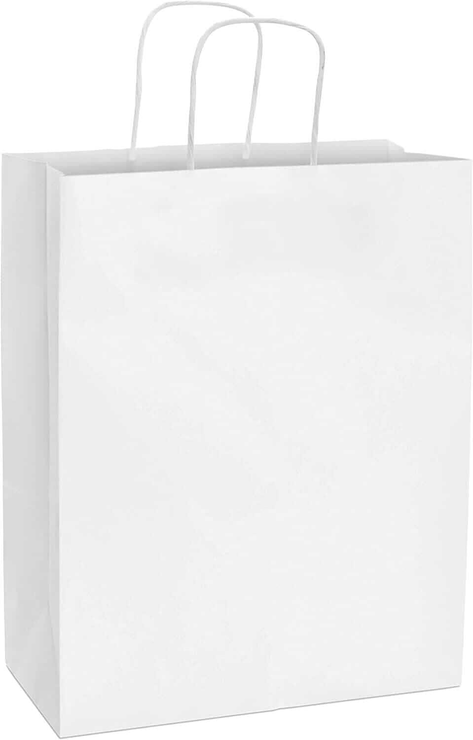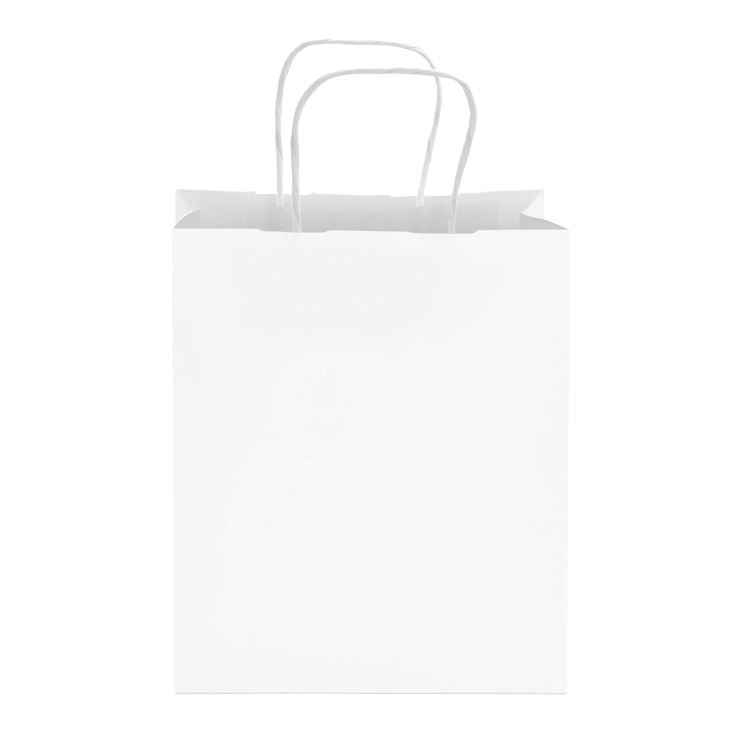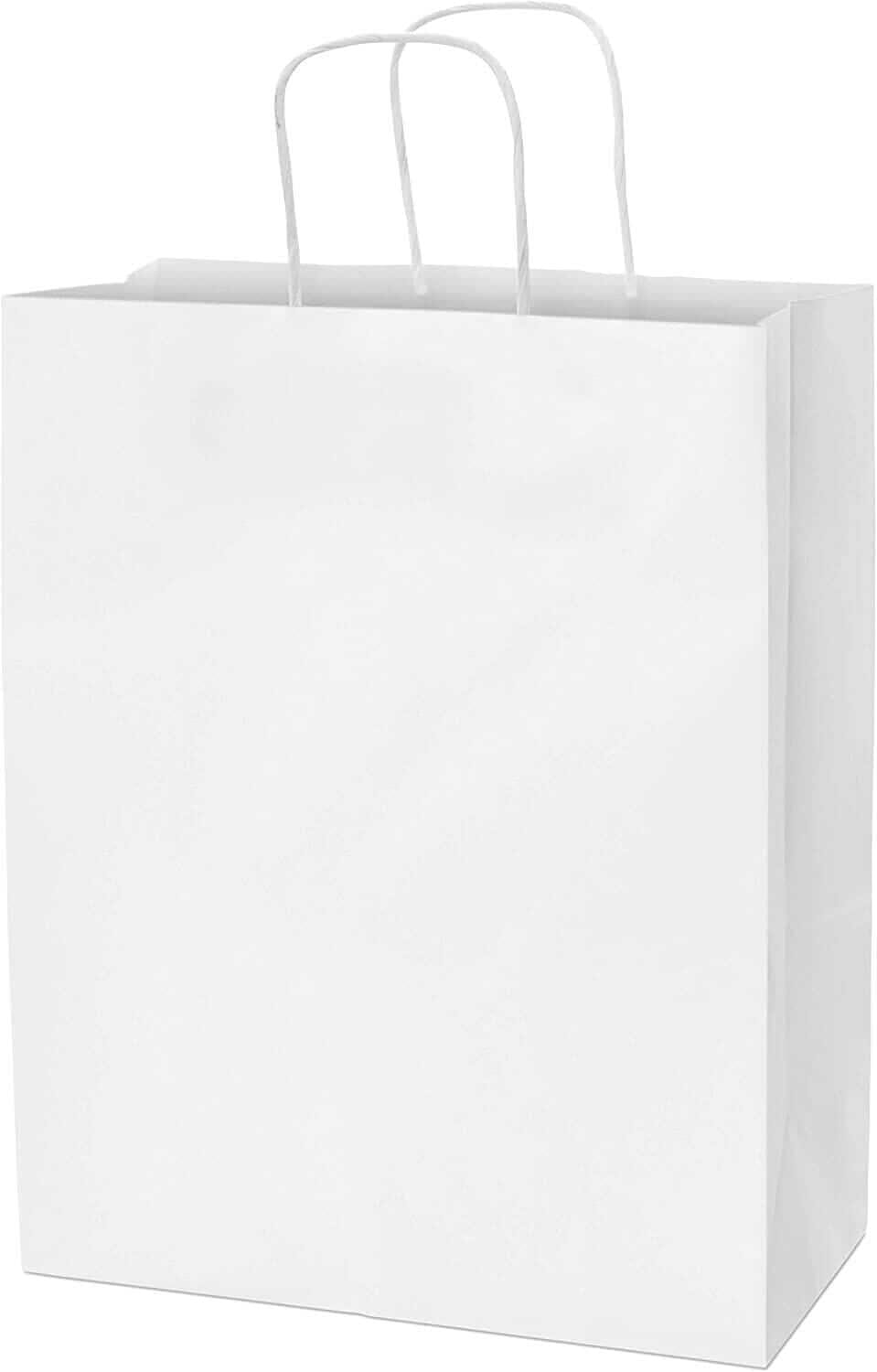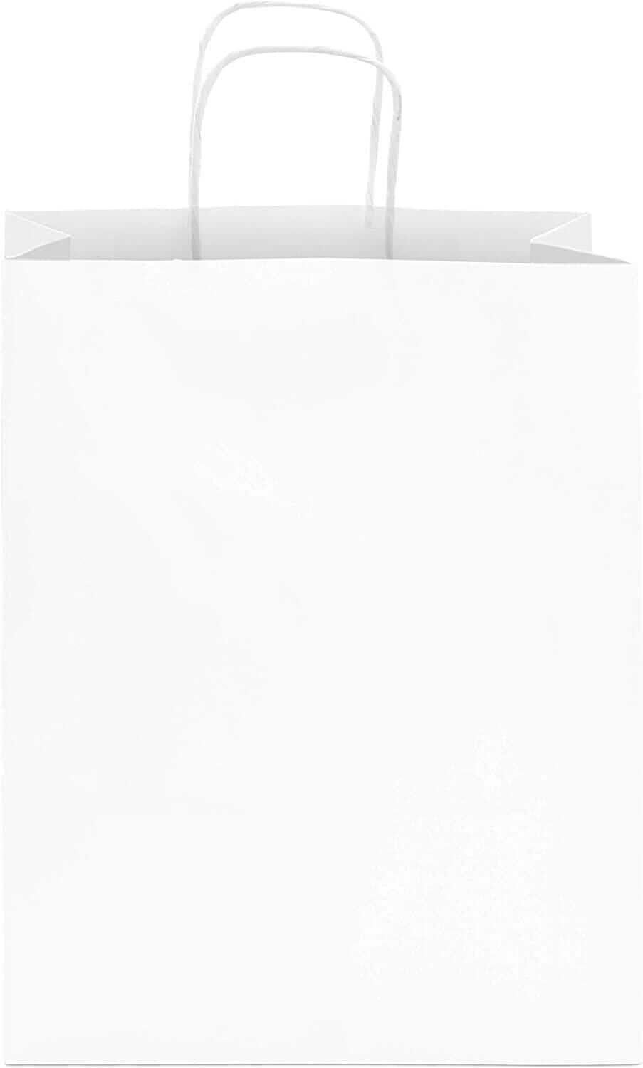 Made by Prime Line Packaging, our 10x6.75x12 inch takeout size white paper bags with handles are the perfect option for either personal or professional everyday uses. Made from 120 GSM FSC certified recyclable kraft paper to ensure maximum load quality and durability, each medium white paper bag comes in your choice of either 50 or 100 packs of bulk bags so you can always have the right amount of paper bags on hand for your small business, boutique, event, or special occasion. Our white kraft paper bags are equipped with sturdy patch reinforced paper twisted handles so you can carry them without having to worry about unwanted rips or tears, while maintaining optimal carrying comfort. Each 10x6.75x12 Inch paper bag is constructed with a squared bottom for easy standup while either loading or unloading. Traditional white paper bags with handles are the perfect option to serve as merchandise bags for your customers and patrons, restaurant bags, party favor holders, creative gift-giving options for your friends and family, or bags for everyday packing and storage use. For the creative mind or the small business owner, these bags can be customized in a variety of ways, serving as a blank canvas to embellish with your business’ logo or to tailor to your own liking with stickers, markers, paints, stamps, ribbons, tissue paper, and more. Kraft paper bags are a popular choice amongst retailers and individuals alike and are versatile in their uses including gift bags, goodie bags, favor bags, shopping bags, takeout bags, and bags for weddings, showers, holidays, and events. Prime Line Packaging’s line of white kraft bags can accommodate any need or event, from gift giving or party favors to customer purchases and take-out orders. Regardless of your needs, the design of these bags and their durable paper twist handles gives them a touch of sophistication while remaining strong when you need them to be.