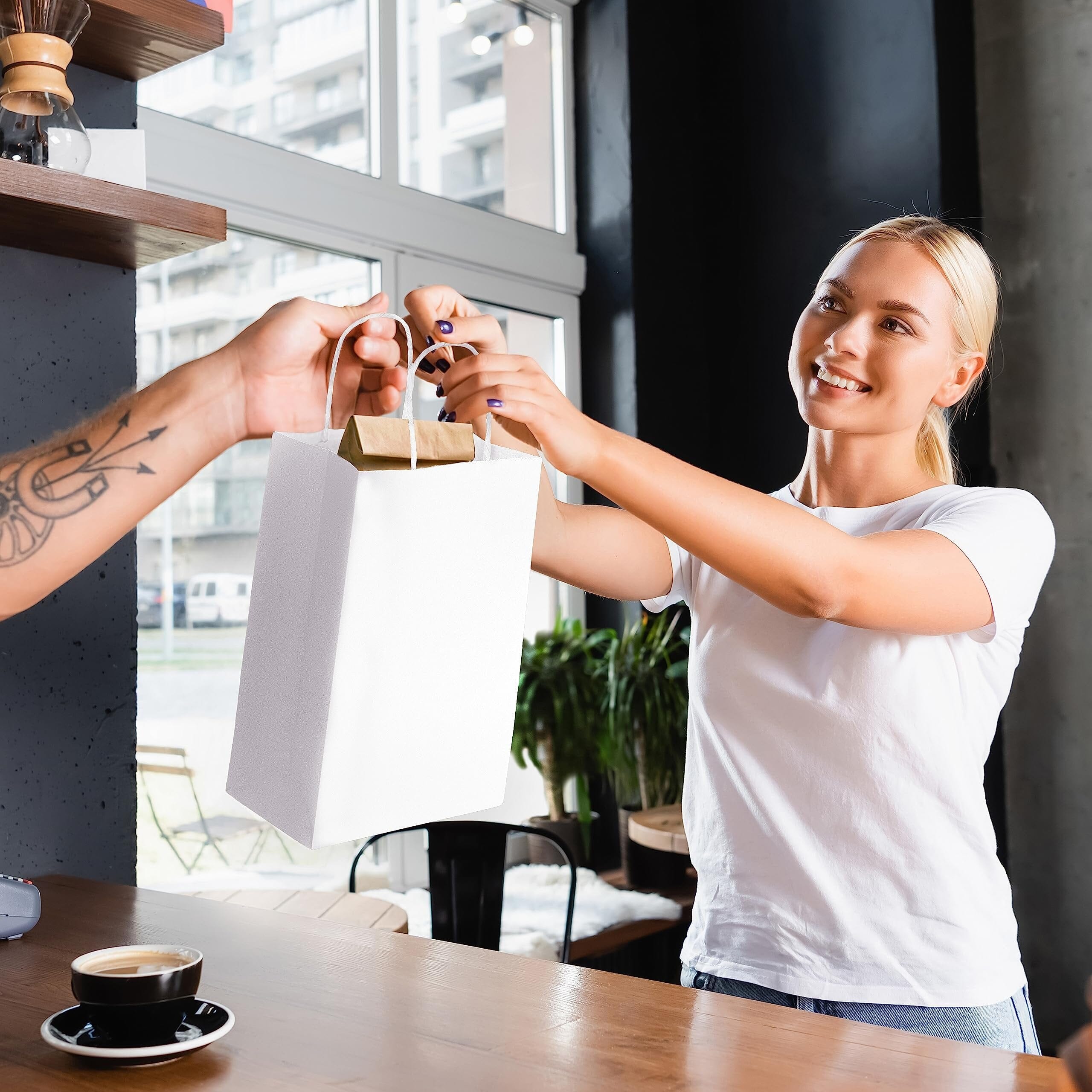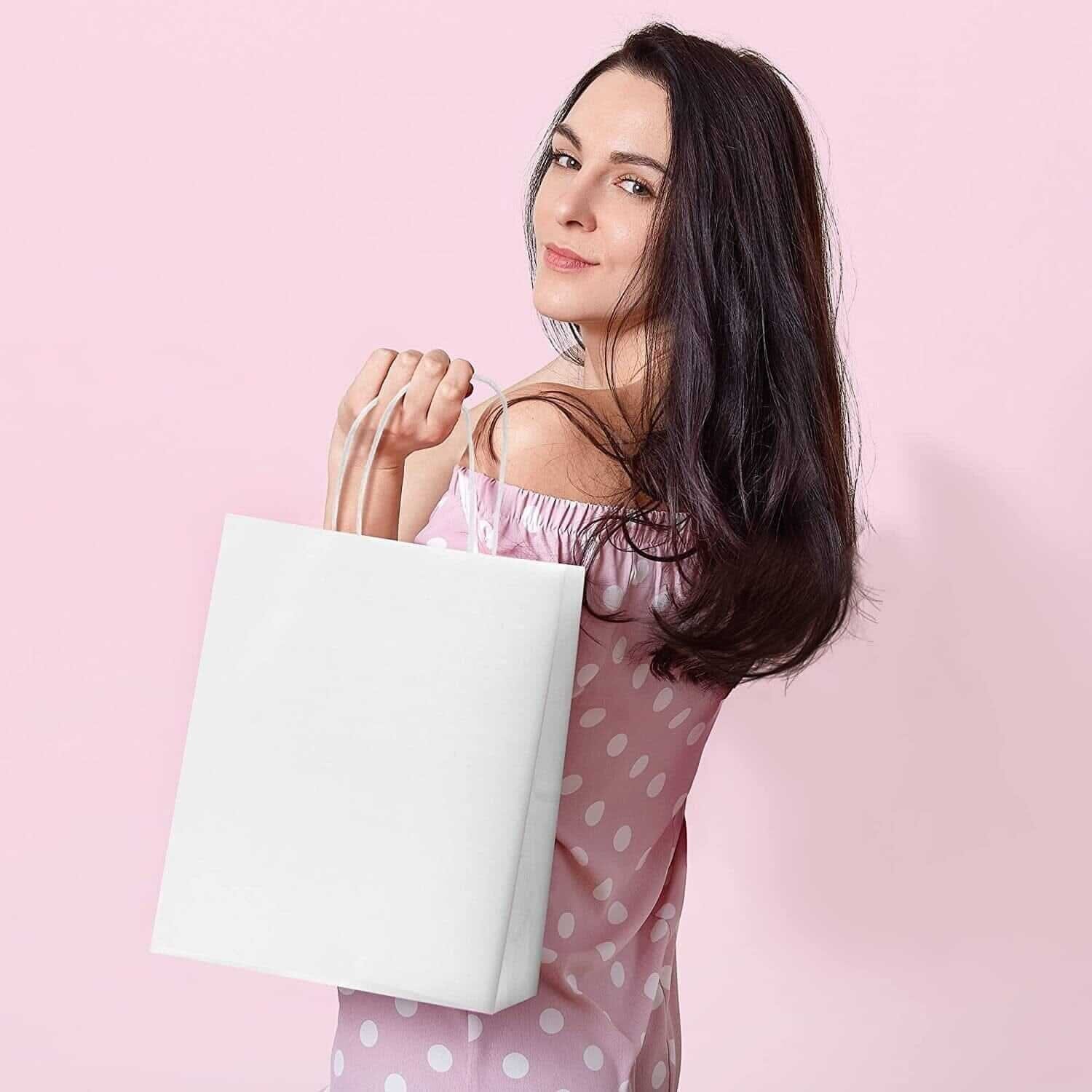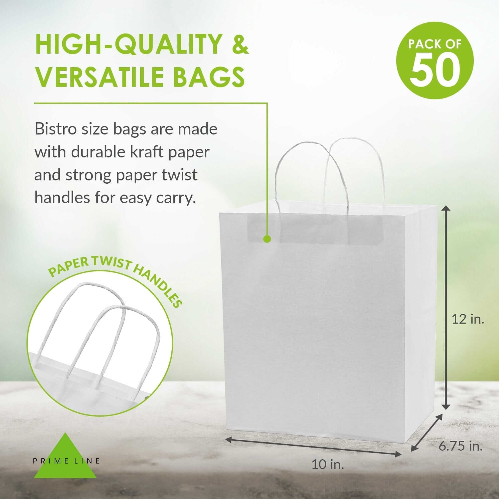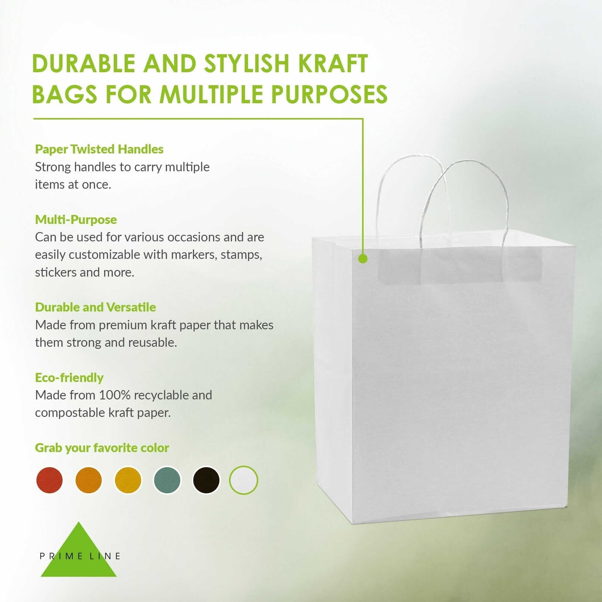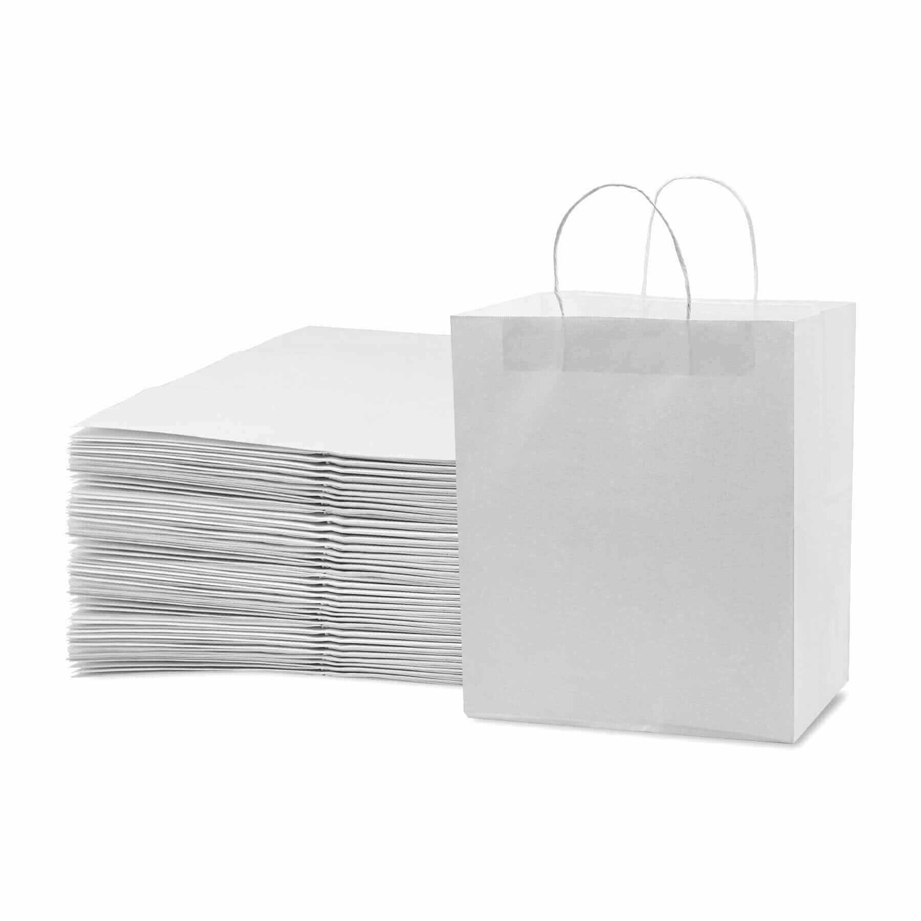 Made by Prime Line Packaging, our 10x6.75x12 inch takeout size white paper bags with handles are the perfect option for either personal or professional everyday uses. Made from 120 GSM FSC certified recyclable kraft paper to ensure maximum load quality and durability, each medium white paper bag comes in your choice of either 50 or 100 packs of bulk bags so you can always have the right amount of paper bags on hand for your small business, boutique, event, or special occasion. Our white kraft paper bags are equipped with sturdy patch reinforced paper twisted handles so you can carry them without having to worry about unwanted rips or tears, while maintaining optimal carrying comfort. Each 10x6.75x12 Inch paper bag is constructed with a squared bottom for easy standup while either loading or unloading. Traditional white paper bags with handles are the perfect option to serve as merchandise bags for your customers and patrons, restaurant bags, party favor holders, creative gift-giving options for your friends and family, or bags for everyday packing and storage use. For the creative mind or the small business owner, these bags can be customized in a variety of ways, serving as a blank canvas to embellish with your business’ logo or to tailor to your own liking with stickers, markers, paints, stamps, ribbons, tissue paper, and more. Kraft paper bags are a popular choice amongst retailers and individuals alike and are versatile in their uses including gift bags, goodie bags, favor bags, shopping bags, takeout bags, and bags for weddings, showers, holidays, and events. Prime Line Packaging’s line of white kraft bags can accommodate any need or event, from gift giving or party favors to customer purchases and take-out orders. Regardless of your needs, the design of these bags and their durable paper twist handles gives them a touch of sophistication while remaining strong when you need them to be.
