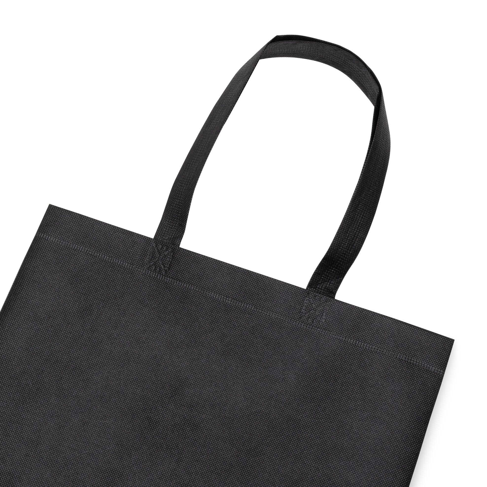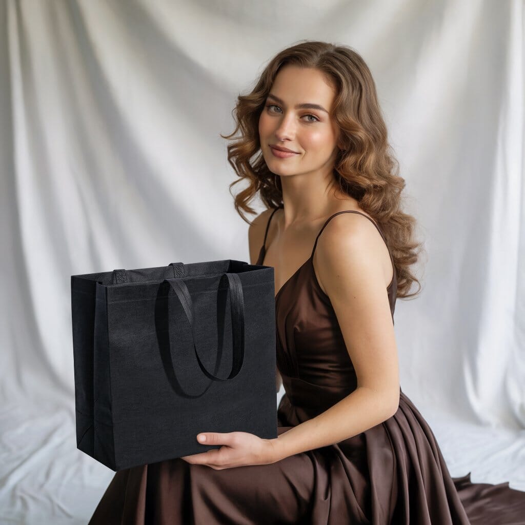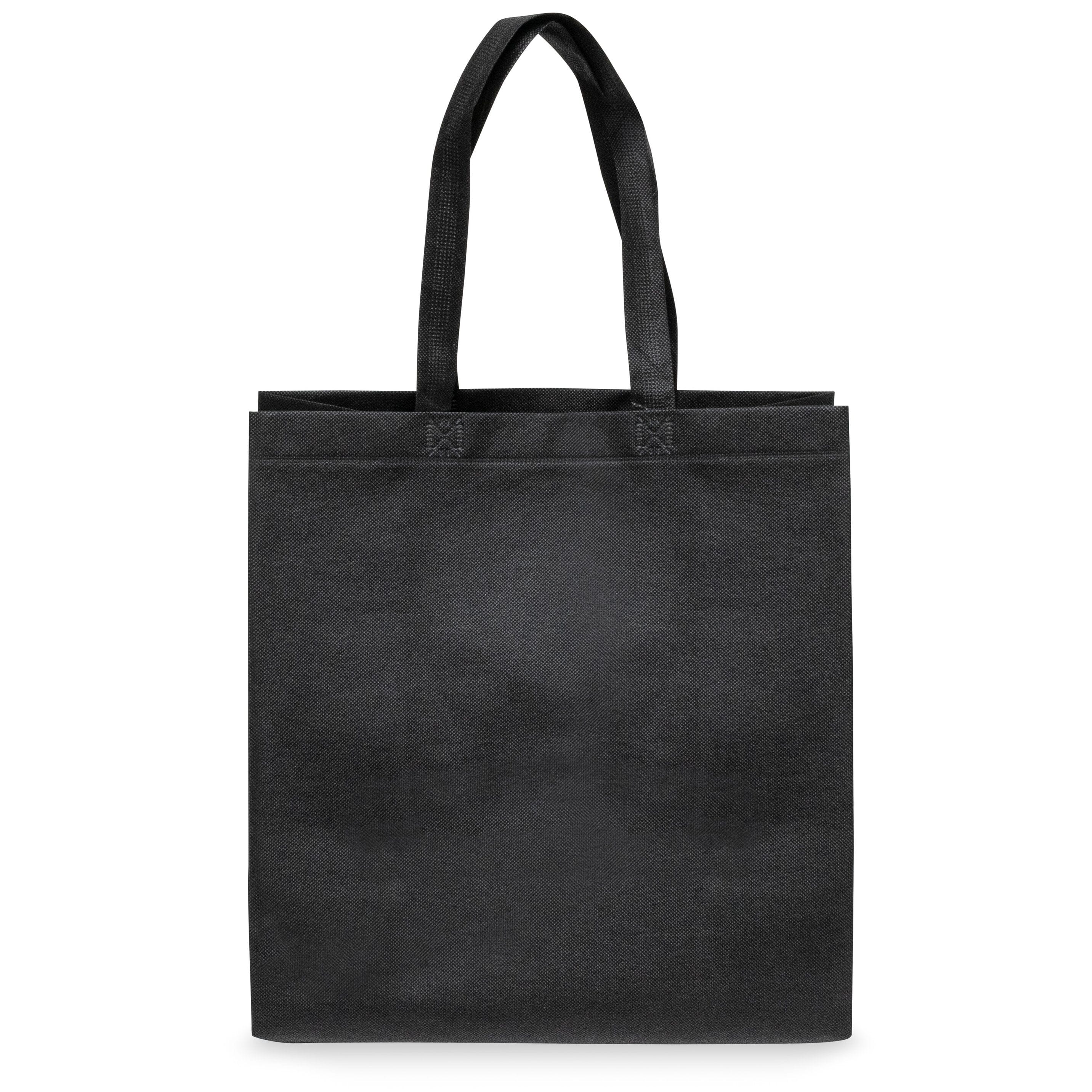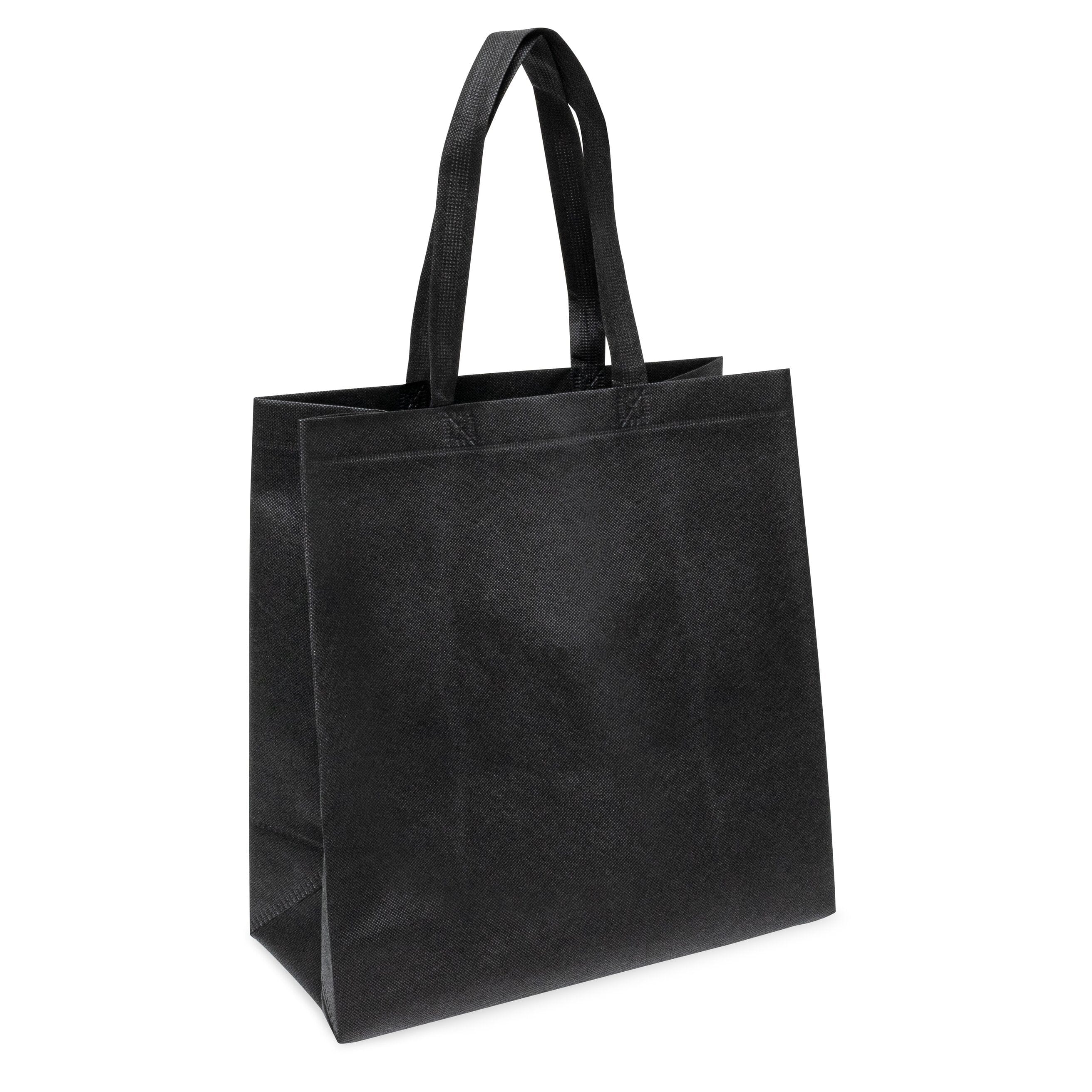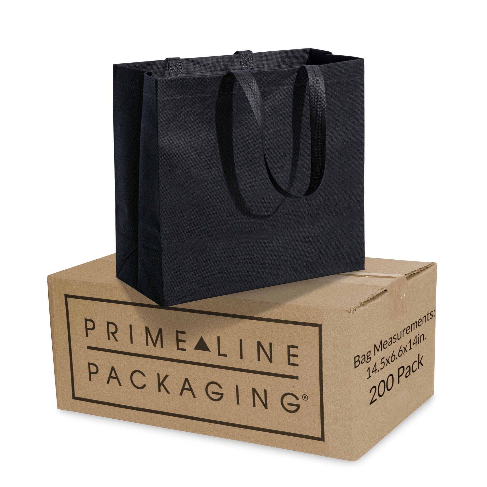 Contributing to a more sustainable, modernized take on the traditional staple of disposable plastic bags, Prime Line Packaging’s reusable black shopping bags with handles are the perfect blend of classic, practical design with the added benefit of increased durability and usage. Crafted from a tough 80 GSM PP non-woven material using sonic welding to create heat-sealed seams, each reusable tote can hold up to 15 pounds, measuring a spacious 14.5” wide by 6.6” deep by 14” tall, making them the optimal size to serve as merchandise bags for a wide variety of needs. From small businesses and boutiques to restaurants, grocery and convenience stores, and event coordinators, each wholesale bulk quantity of reusable fabric bags can be used as thank you bags, grocery bags, merchandise bags, and totes for shopping, events, storage and more in professional or personal settings. Comfortably carry a range of different items including produce, groceries, electronics, apparel, books, accessories, and more depending on your individualized needs. The plain, durable black bags are subtle in design to accommodate multiple needs as is, but can be further customized with a company or business logo, statement, or design using non heat transferrable vinyl, stickers, or markers to add a personalized embellishment where desired. Leave a lasting impression on your customers and patrons in addition to giving them the confidence their purchase will be kept safe and secure from unwanted rips and tears with one of Prime Line Packaging’s high-strength reusable black shopping bags.