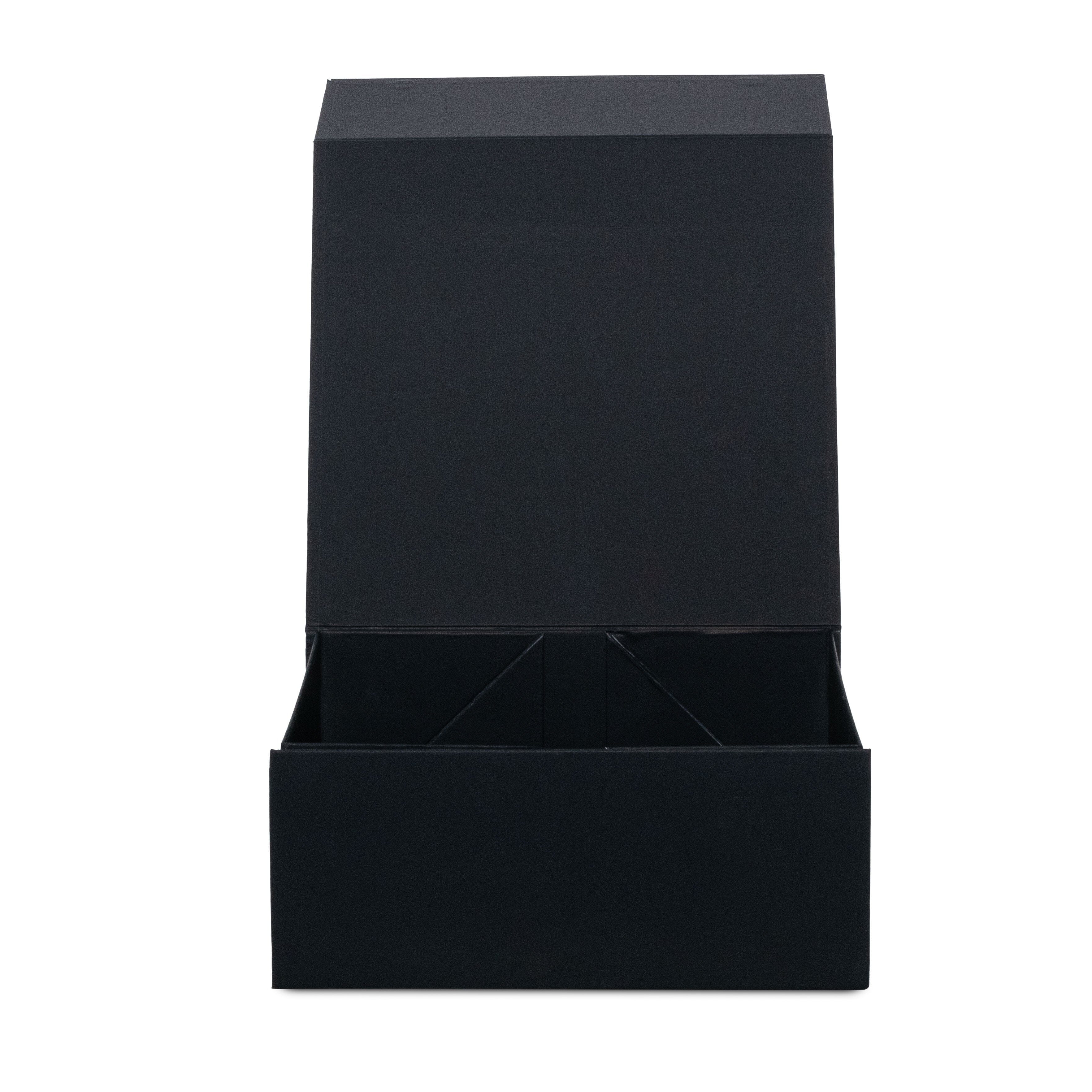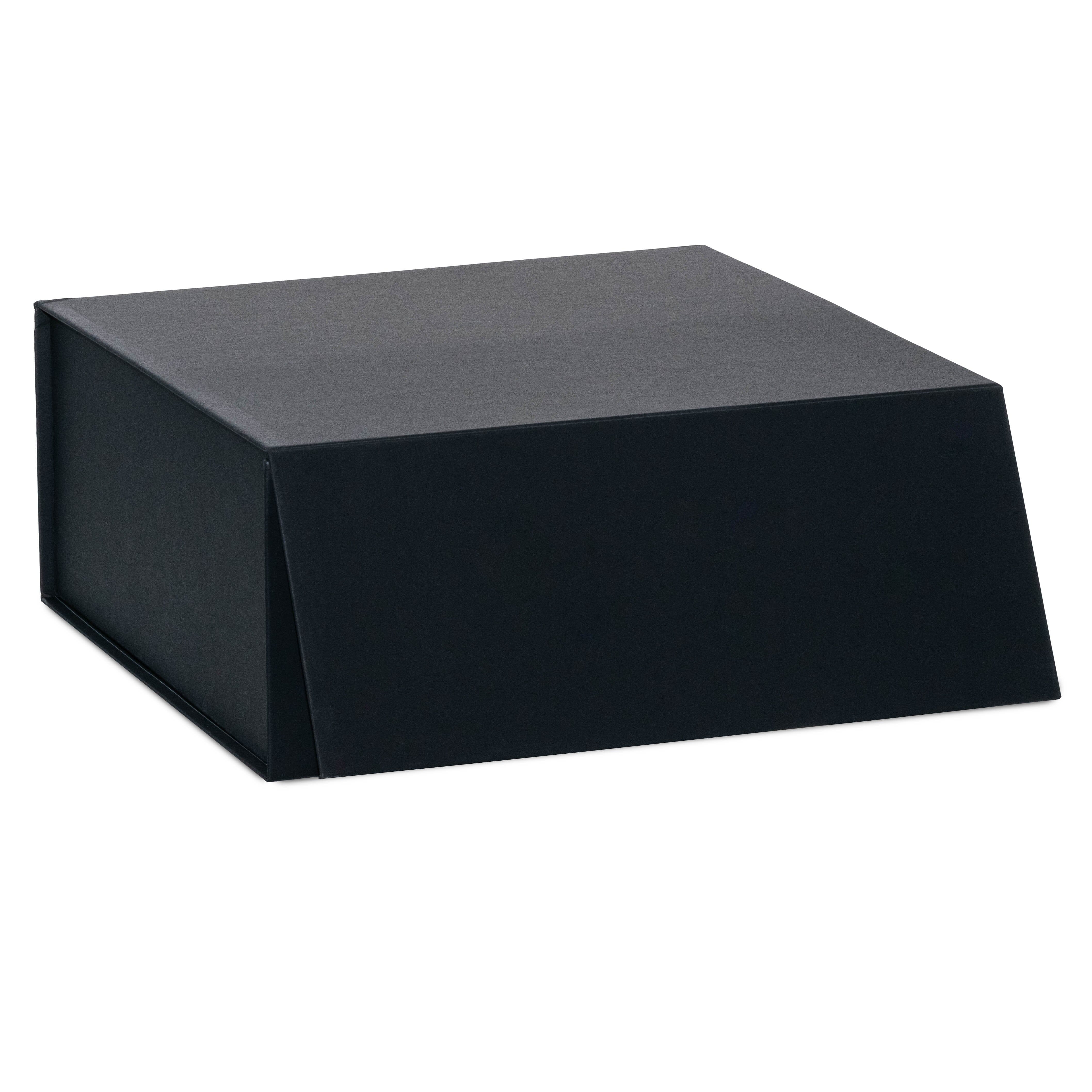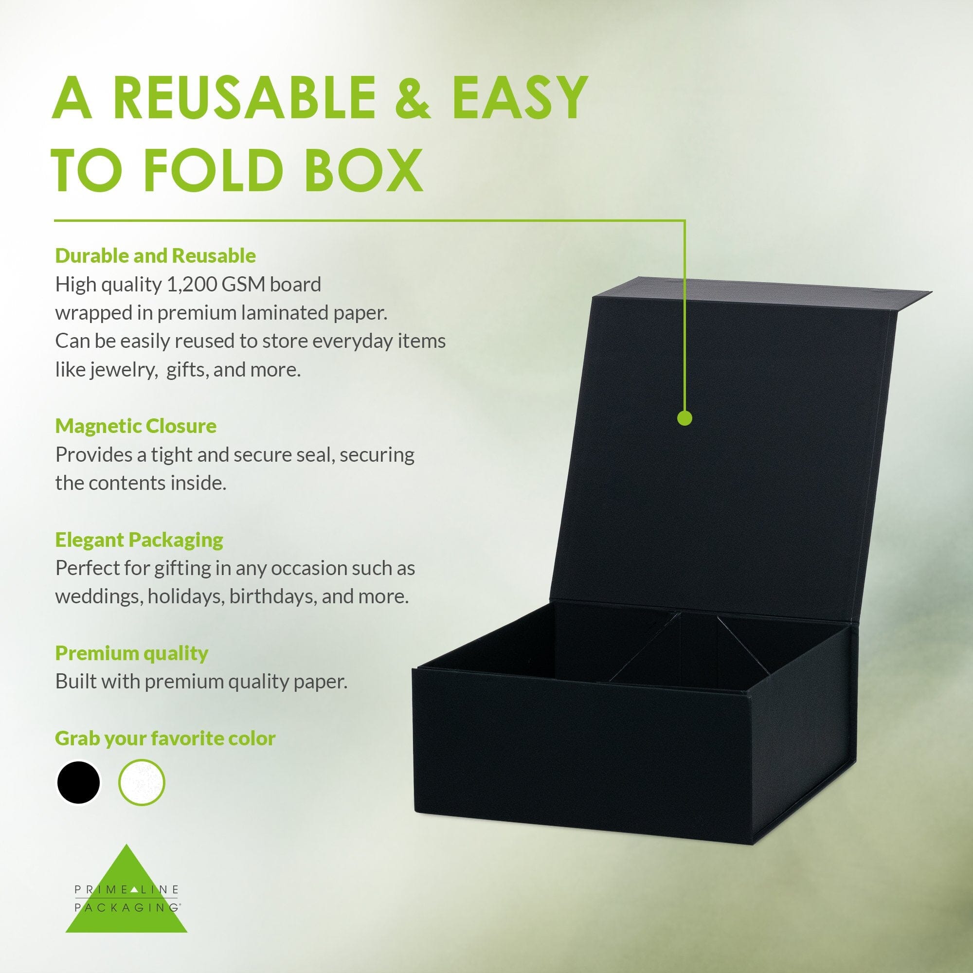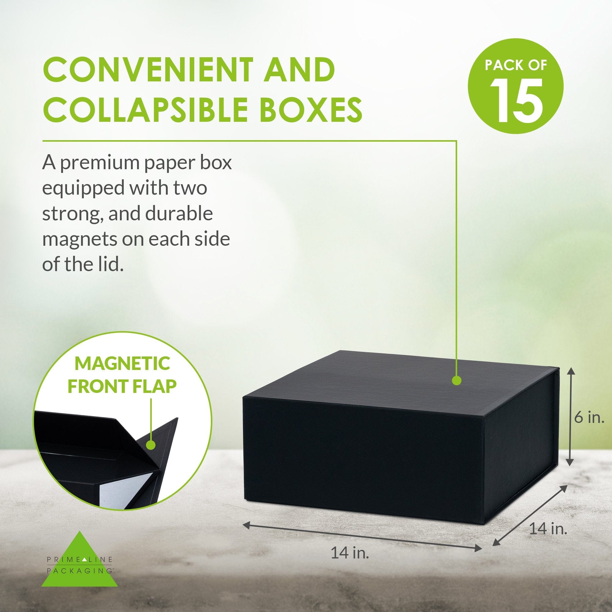 Prime Line Packaging's unprinted black 14x14x6 collapsible magnetic closure gift boxes are the perfect option for packing, storing, organizing, displaying, and presenting a wide variety of personal and professional needs. Crafted from a durable 1,500 GSM art board wrapped in premium 157 GSM matte laminated paper, each high-quality gift box comes equipped with two extra strong magnet closures seamlessly incorporated into the lid to ensure its contents stay safe and secure. When not in use, each magnetic gift box can conveniently fold flat for easy, compact out of the way storage. Black gift boxes are a perfect, high quality, reusable and practical alternative to traditional shopping bags and gift bags. Prime Line Packaging’s 14x14x6 black gift boxes are highly versatile in being able to act as gift boxes for birthdays, parties, holidays and events to merchandise boxes for apparel, jewelry, accessories and more. Unprinted boxes are perfect for gifting, home organization, or retail needs alike, and can be used to uniformly store a wide variety of items. Coming in large bulk packs, you can always have a box on hand for your small business or event and have enough boxes on hand to create bridesmaid or groomsman proposal boxes for your special day. For the creative spirit or the small business owner, these boxes can be customized in a wide variety of ways, serving as a blank canvas to embellish with your businesses’ logo or tailor to your own liking with non-heat transferrable vinyl, stickers, markers, paints, stamps and more. A sophisticated and elegant touch can be added with ribbon and bows to finish the look. Magnetic boxes serve as a unique and memorable reusable alternative to gift or shopping bags and are a popular choice amongst retailers large and small, event planners, and individuals for gift giving and storage. Keep your goods safe and secure with Prime Line Packaging’s reusable black magnetic closure boxes for any of your needs.
