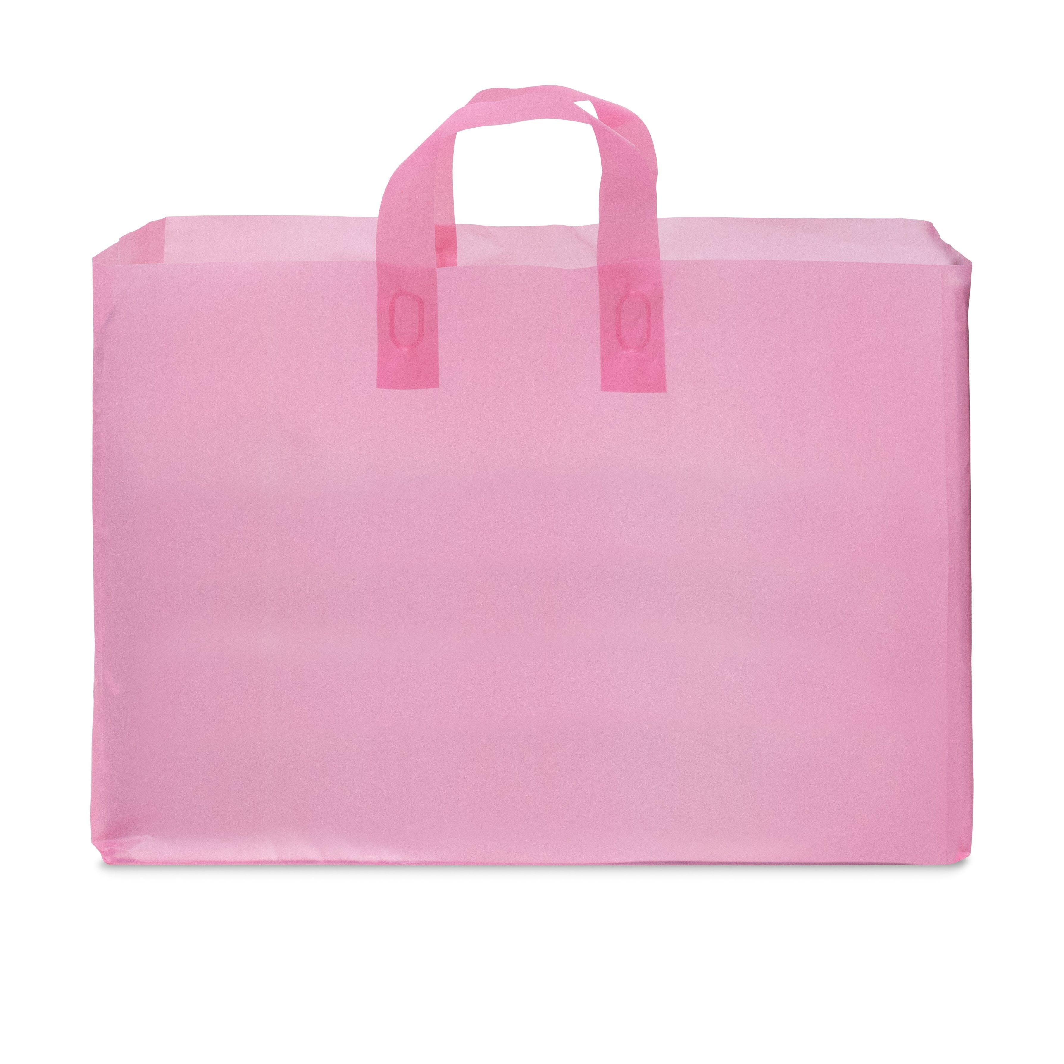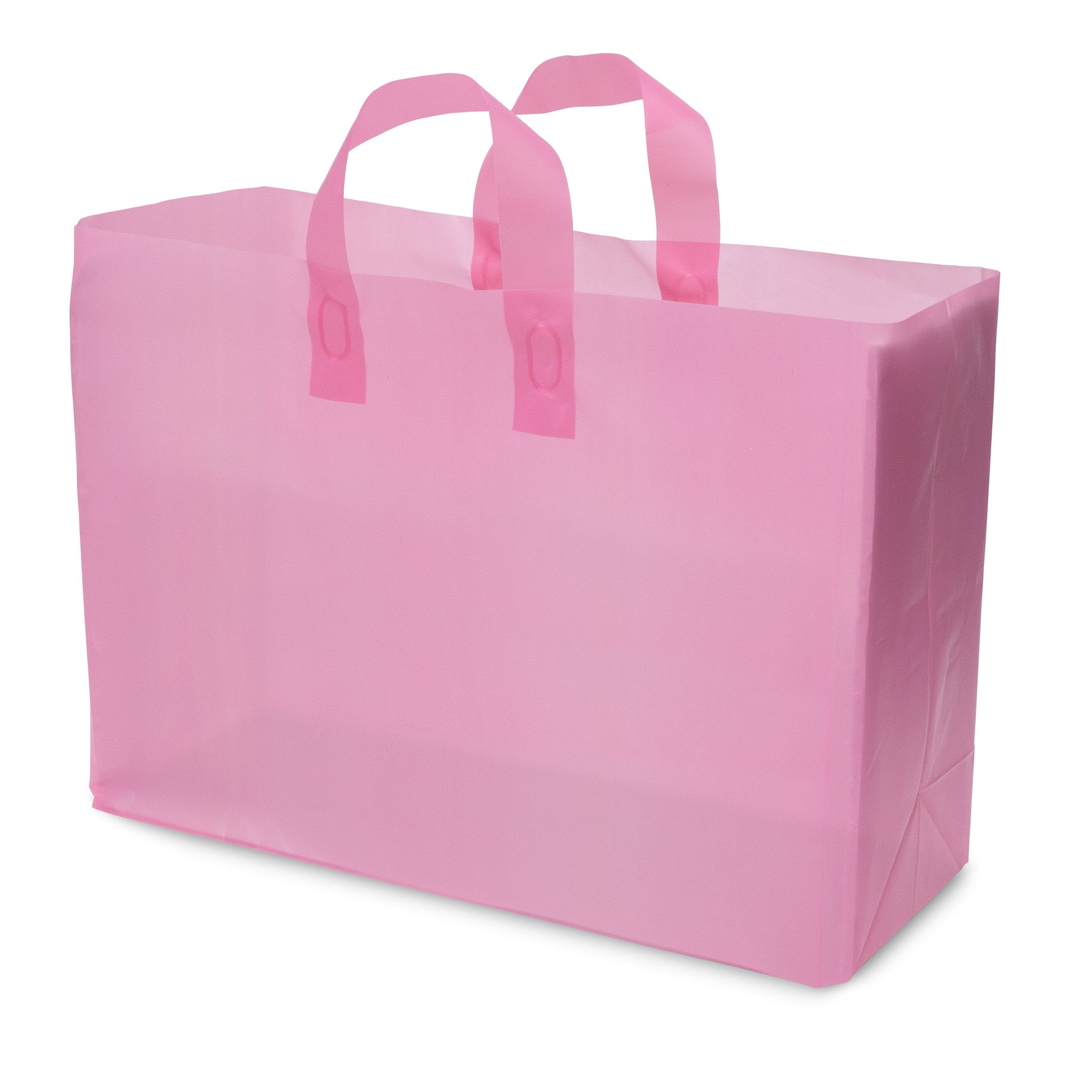 Made by Prime Line Packaging, our 16x6x12 inch large frosted pink plastic bags with handles are the perfect option for either personal or professional everyday uses. Made from 2.5 Mil semi-transparent frosted polyethylene plastic to ensure maximum load quantity and durability, Prime Line Packaging’s large frosted pink plastic shopping bags come in bulk carton quantities so you can always have enough bags on hand for your small business, boutique, organization, restaurant, or event. Our line of one of a kind frosted plastic bags are equipped with premium soft loop handles to maintain optimal carrying comfort and strength in addition to 350 GSM cardboard bottom inserts for added support and stability. The frosted, semi clear bags finish adds a balance of privacy in a stylish way, while the thick plastic helps shield the contents from the elements. Plastic bags with handles are the perfect option to serve as merchandise bags, restaurant take out bags, party favor bags, gift bags, or everyday shopping bags for your customers and patrons. For the small business owner or creative mind, each bag can be customized in a variety of ways, from adding decorative embellishments to prominently displaying your business’s logo using non heat transfer vinyl, stickers, ribbon, tissue paper and more. Plastic bags are a popular choice amongst retailers, restaurants, and individuals alike for their versatility and durability. Prime Line Packaging’s line of frosted pink plastic bags can accommodate any need or event, from event bags to gift giving to small businesses. Regardless of your needs, Prime Line Packaging’s frosted plastic bags with soft loop handles give a touch of elegance to strength and practicality when you need them to be.