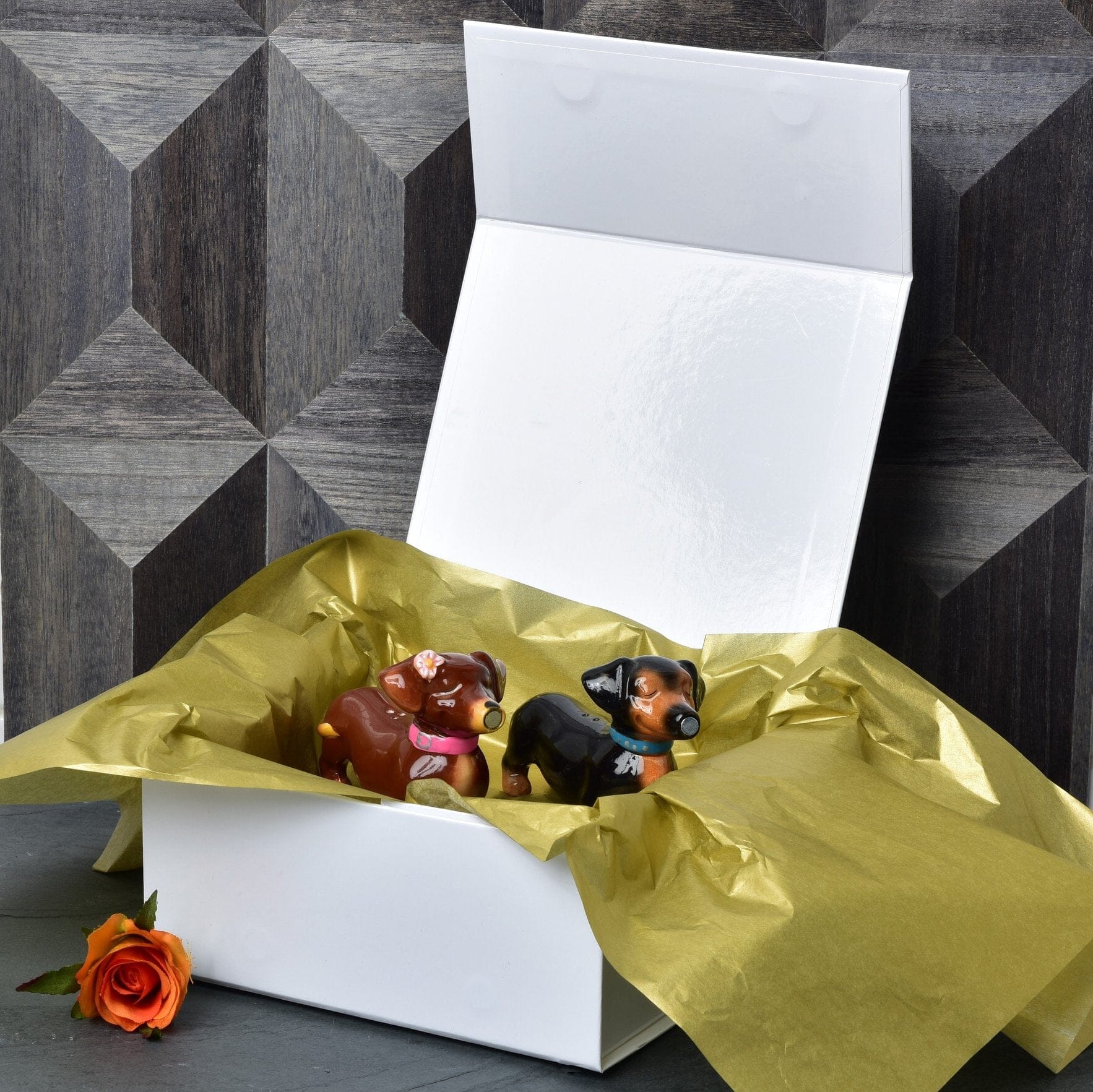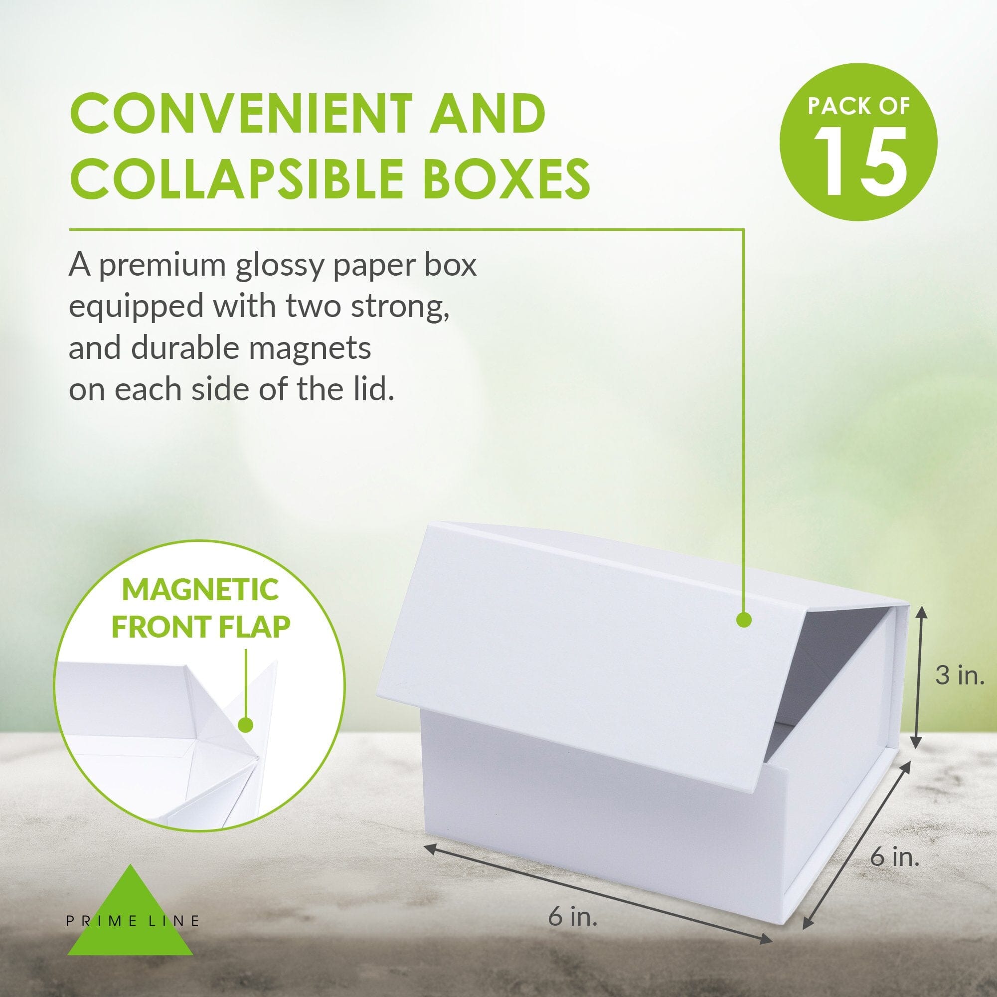 Prime Line Packaging's unprinted white 6x6x3 collapsible magnetic closure gift boxes are the perfect option for packing, storing, organizing, displaying, and presenting a wide variety of personal and professional needs. Crafted from a durable 1,000 GSM art board wrapped in premium 157 GSM gloss laminated paper, each high-quality gift box comes equipped with two extra strong magnet closures seamlessly incorporated into the lid to ensure its contents stay safe and secure. When not in use, each magnetic gift box can conveniently fold flat for easy, compact out of the way storage. White gift boxes are a perfect, high quality, reusable and practical alternative to traditional shopping bags and gift bags. Prime Line Packaging’s 6x6x3 white gift boxes are highly versatile in being able to act as gift boxes for birthdays, parties, holidays and events to merchandise boxes for apparel, jewelry, accessories and more. Unprinted boxes are perfect for gifting, home organization, or retail needs alike, and can be used to uniformly store a wide variety of items. Coming in large bulk packs, you can always have a box on hand for your small business or event and have enough boxes on hand to create bridesmaid or groomsman proposal boxes for your special day. For the creative spirit or the small business owner, these boxes can be customized in a wide variety of ways, serving as a blank canvas to embellish with your businesses’ logo or tailor to your own liking with non-heat transferrable vinyl, stickers, markers, paints, stamps and more. A sophisticated and elegant touch can be added with ribbon and bows to finish the look. Magnetic boxes serve as a unique and memorable reusable alternative to gift or shopping bags and are a popular choice amongst retailers large and small, event planners, and individuals for gift giving and storage. Keep your goods safe and secure with Prime Line Packaging’s reusable white magnetic closure boxes for any of your needs.