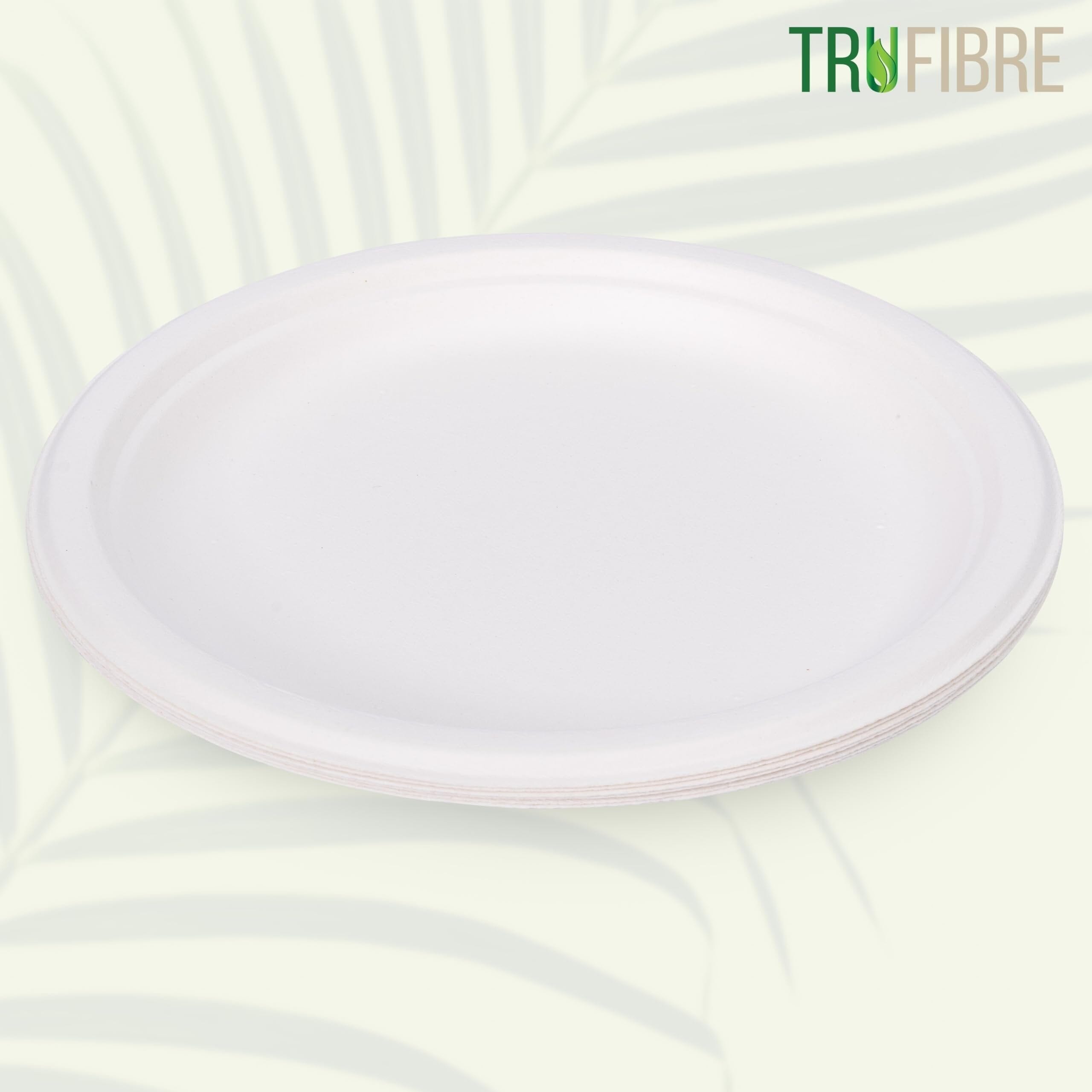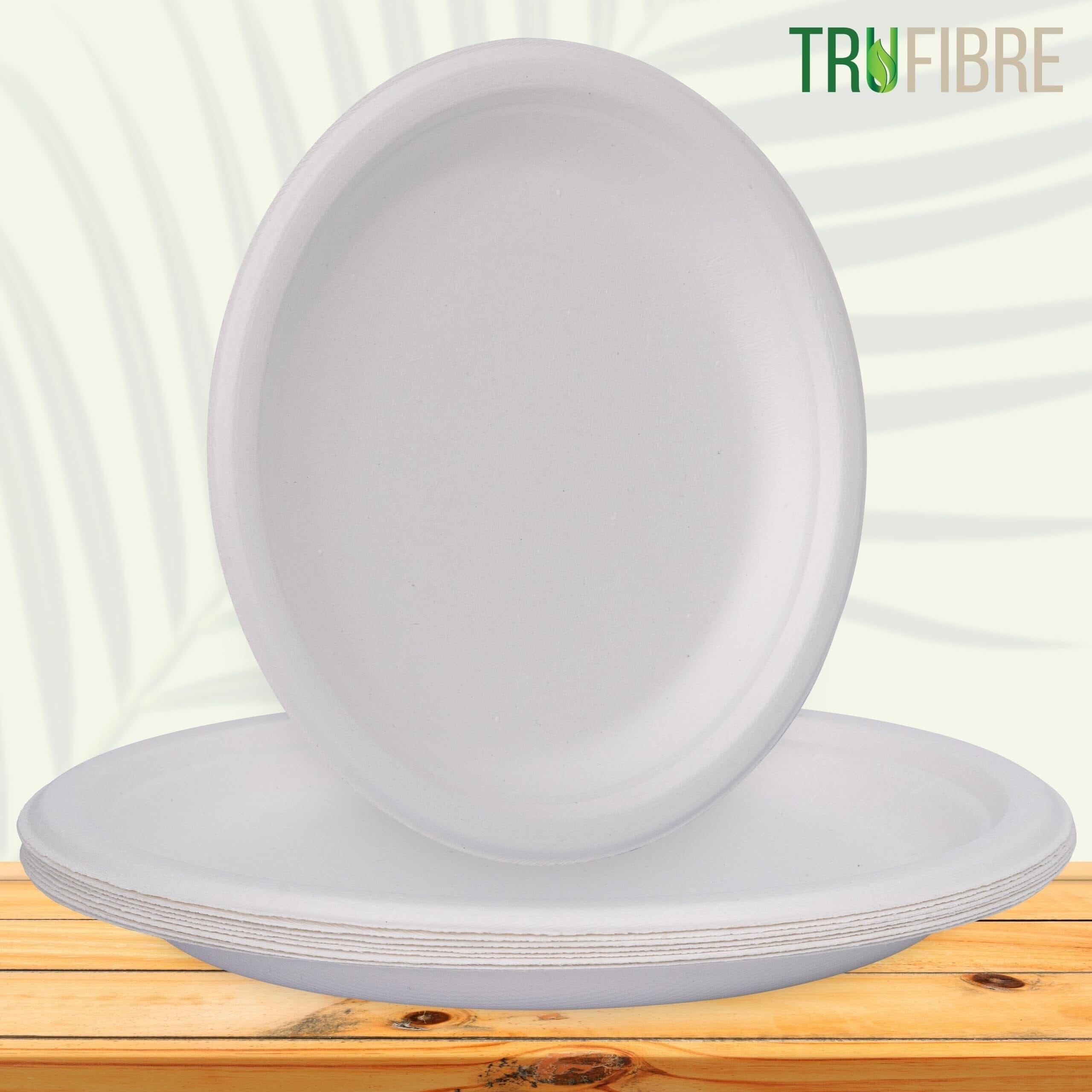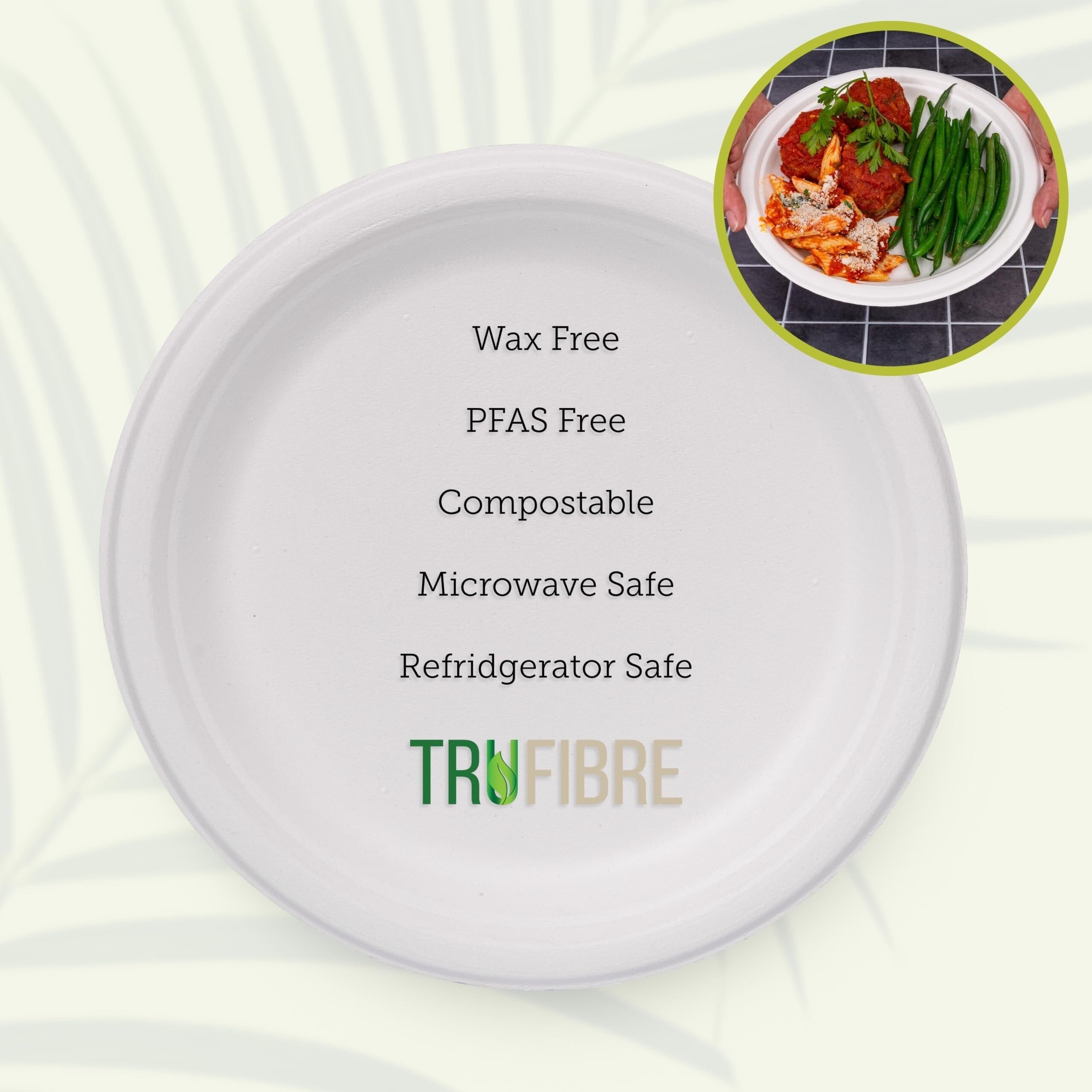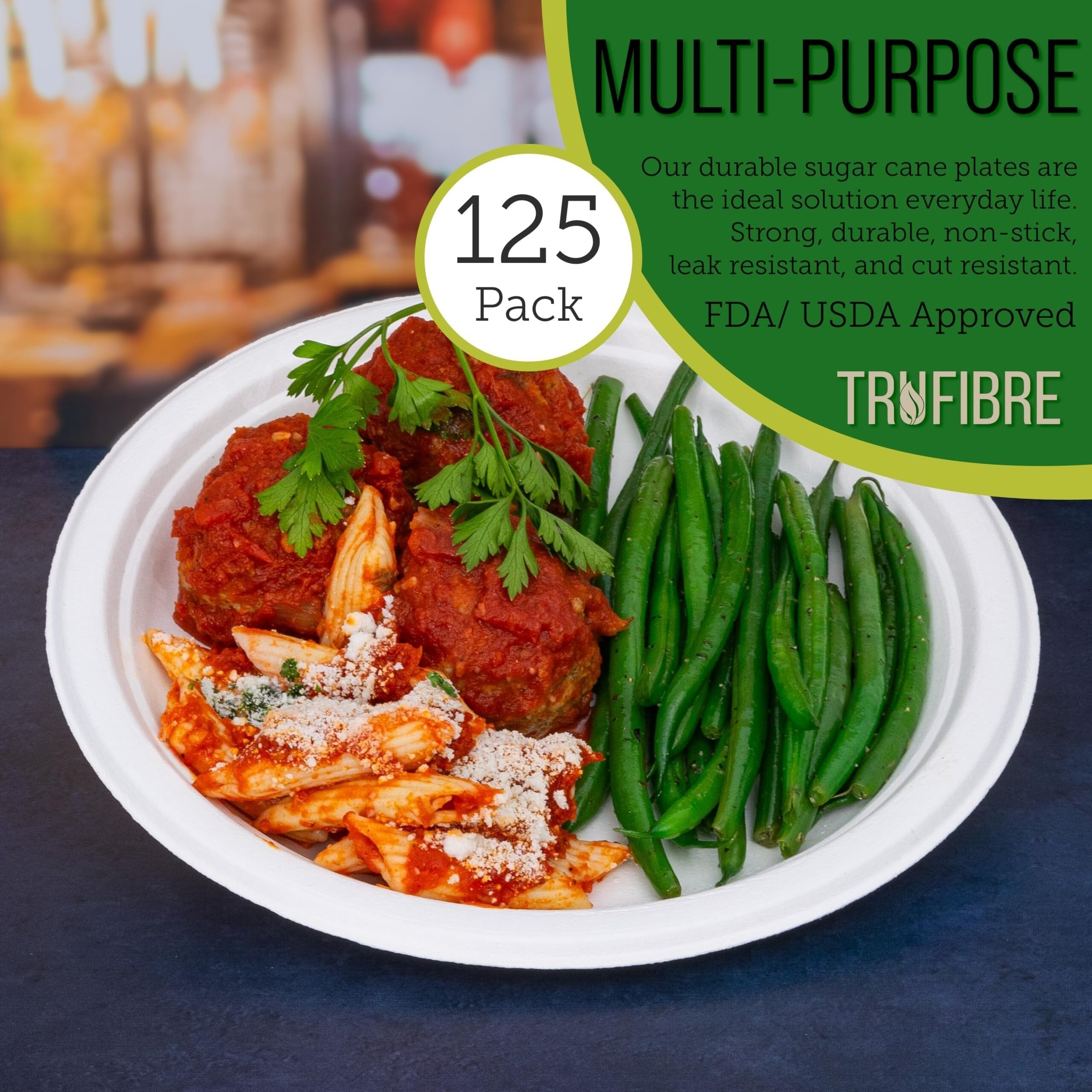 Striving for higher quality, more cost-effective and eco friendly solutions to everday household and business needs, TruFibre’s heavy duty bagasse plates are the product of taking the best, most often overlooked characteristics of simple, everyday products and making them better. Coming in bulk packs of 125, each of TruFibre’s disposable plates are made from 15-gram bagasse, a sustainable and eco-friendly biproduct of processing Sugarcane fibers, making each platter entirely biodegradable, 100% compostable, and environmentally friendly. With their heavy-duty construction, each paper plate is both nonstick and cut resistant while maintaining a lightweight design. Each plate was further designed to prevent unwanted residue from leaking through the bottom, leaving unwanted residue on surfaces. TruFibre’s plates are both microwavable and refrigerator safe. Being both BPA and PFAS free, paper plates are a common choice in the food service industry for their uniform, easily stackable design and their ideal size. Measuring either 6" or 9” in diameter, restaurants, food vendors, and catering services can use plates for serving a variety of appropriately sized foods or dishes including breakfast, lunch, dinner, or dessert, sandwiches, burgers, hot dogs, cake slices, and portions of sides including fries, salads, pastas, and more. Heavy duty paper plates are not only ideal for businesses and vendors, but are also a quick, disposable, and time saving way for individuals to eat their meals or snacks without the worry of washing dishes. Whether you’re a restaurant looking for high-quality, cost-effective solutions or an individual looking for easier ways to serve your foods, TruFibre’s 125 count bulk paper plates are the perfect choice.
